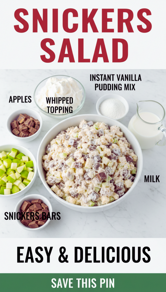 I have heard this called a bunch of things, and people get weirdly passionate about what the correct name is. Some call it apple Snickers salad, some call it candy bar salad, and I have even heard fluff salad. Whatever you call it, the vibe is the same: crisp apples, chopped candy bars, and a creamy base that feels like a treat.