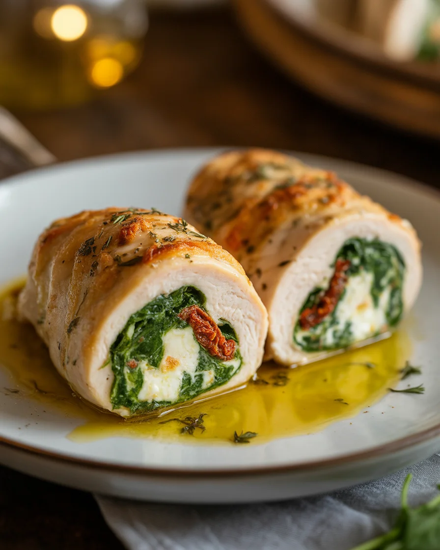Juicy chicken rolls stuffed with garlicky spinach and tangy feta cheese, perfect for an easy weeknight dinner that feels fancy.