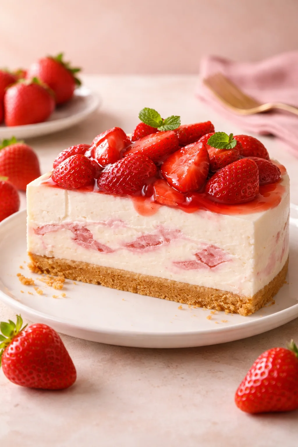 I am calling this a cheesecake cake because it has that fun layered vibe, but do not worry, it is not complicated. You get a buttery crust, a thick creamy center, and a strawberry topping that tastes like fresh fruit, not candy. It is the kind of dessert that gets quiet for a second when people take the first bite.