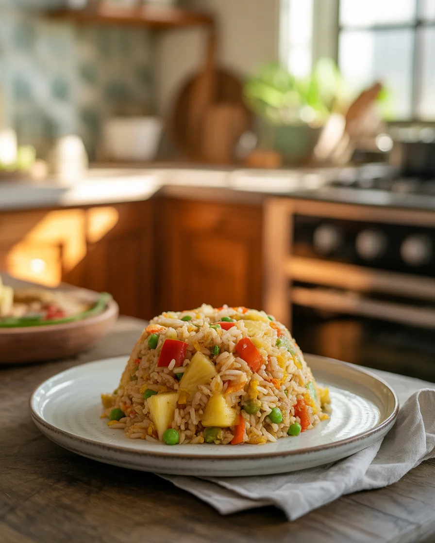 To make one, slice the pineapple lengthwise, keeping the green top attached for drama. Run a knife around the edges, then score a criss-cross pattern in the center. Scoop out chunks with a spoon. Drain the shell upside down for a few minutes so it doesn’t leak into the rice. That’s it. You’ve got a fun serving bowl that wows your family, roommates, or your camera.