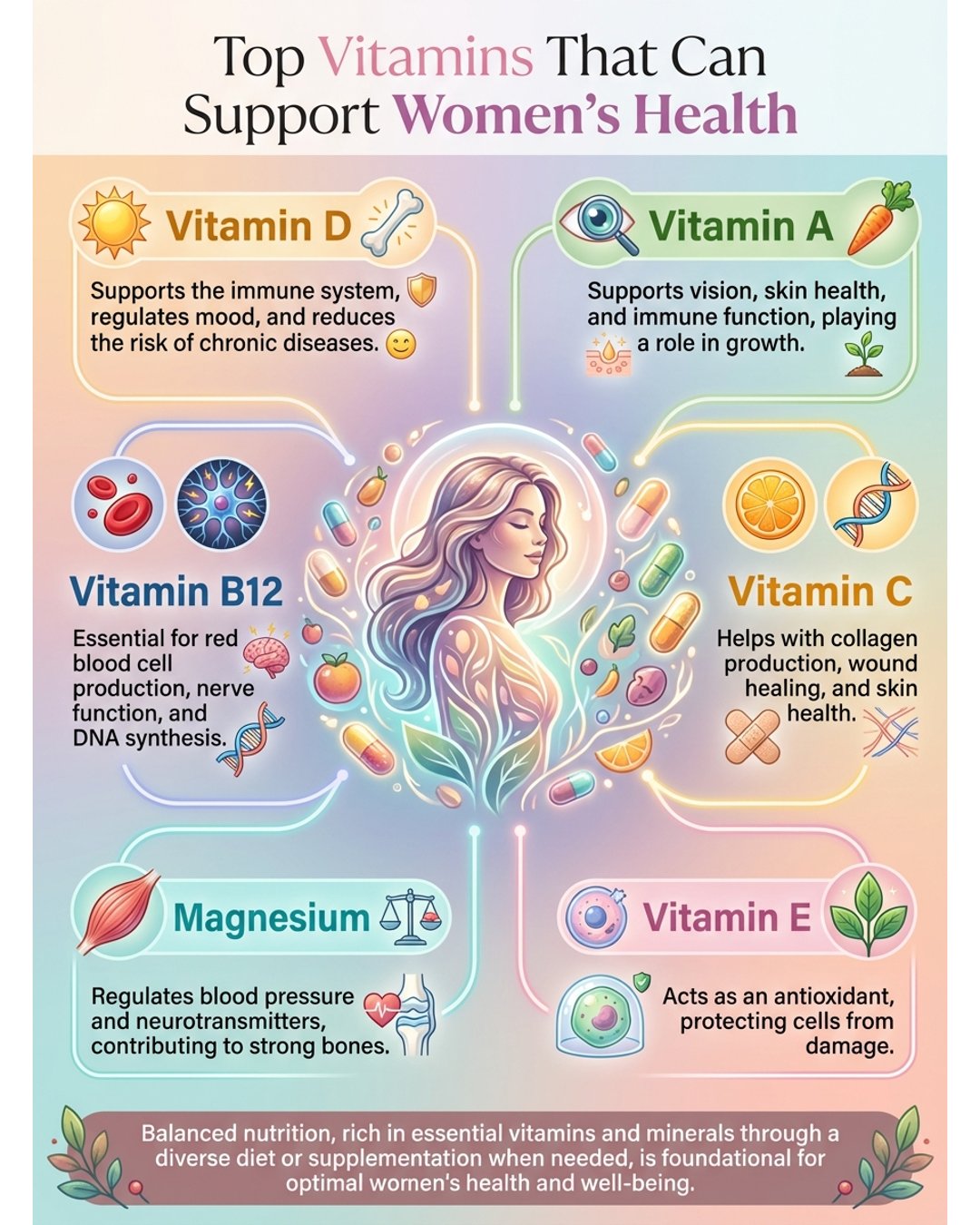 - Women have unique needs at different agesโthink iron, folate, vitamin D.