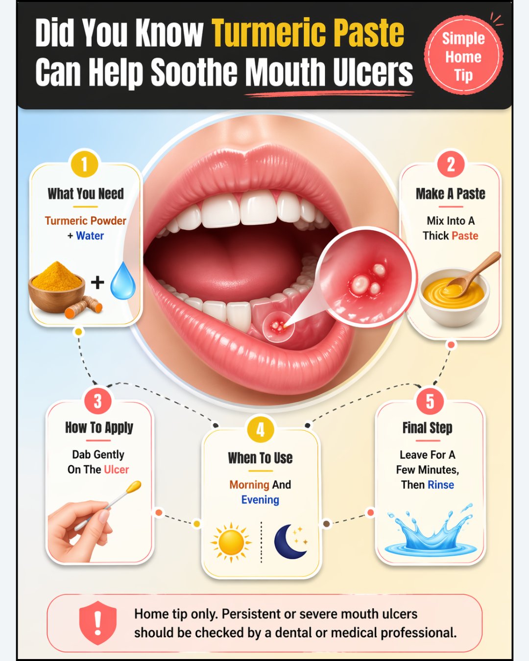 - Just mix a bit of turmeric powder with water or honey, dab it right on the sore—try not to drool too much! If you want the nitty-gritty, browse this in-depth post on turmeric for mouth ulcers.