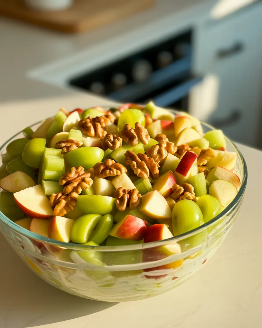 Alright, here’s my can’t-mess-it-up way. I usually dice up two apples (no need to peel, just give ’em a wash), two stalks of celery sliced thin, a cup of grapes halved, and about half a cup of walnuts, roughly chopped. In a bowl: toss the apples and celery with a squeeze of lemon first, or they’ll go brown and sad-looking. Then everything else piles in. The dressing? Eyeball a couple tablespoons of mayo, and, if you’re feeling it, stir in a spoonful of Greek yogurt for zing. Salt and pepper. Stir. That’s it. This is one of those recipes you shouldn’t overthink. If you need more creaminess, add dressing bit by bit. Chill it for the best taste, but honestly, it’s good straight away.